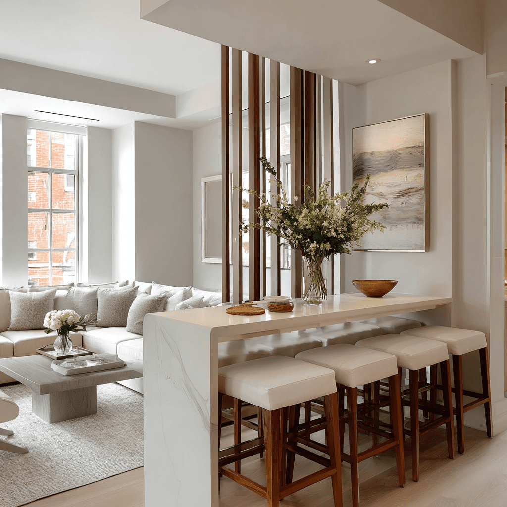 A bar-height table works double duty as a dining spot and a visual divider between the TV and seating area. It subtly separates zones without walls or partitions.