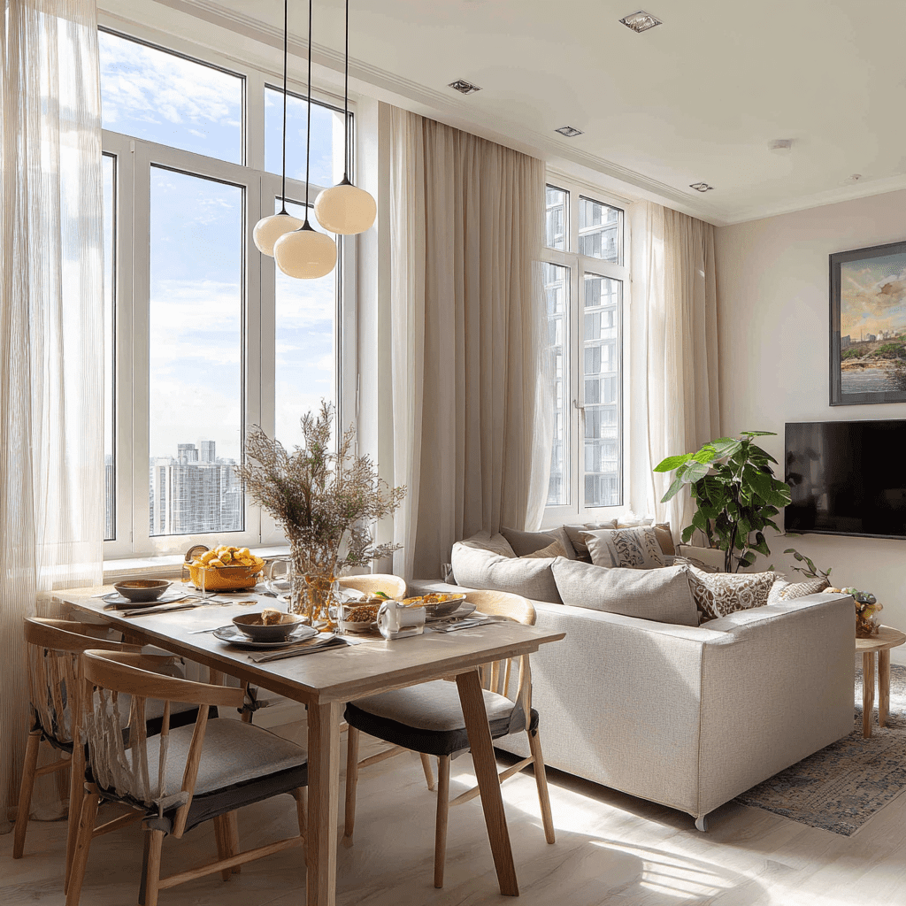 This is one of the most practical small living room ideas with TV and dining table setups.
