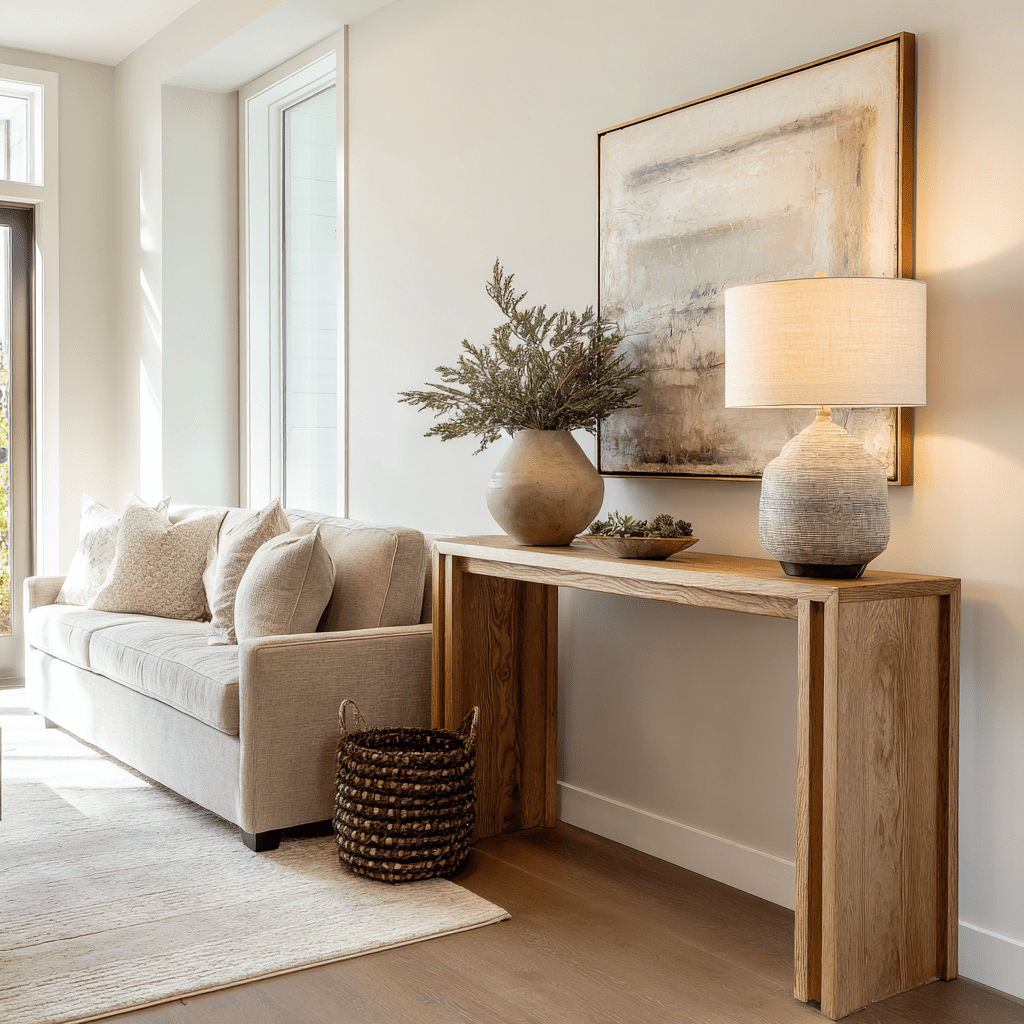A slim console table is the easiest win if your sofa floats in the room. It’s narrow enough to fit tight spaces but wide enough for lamps, books, or a drink.