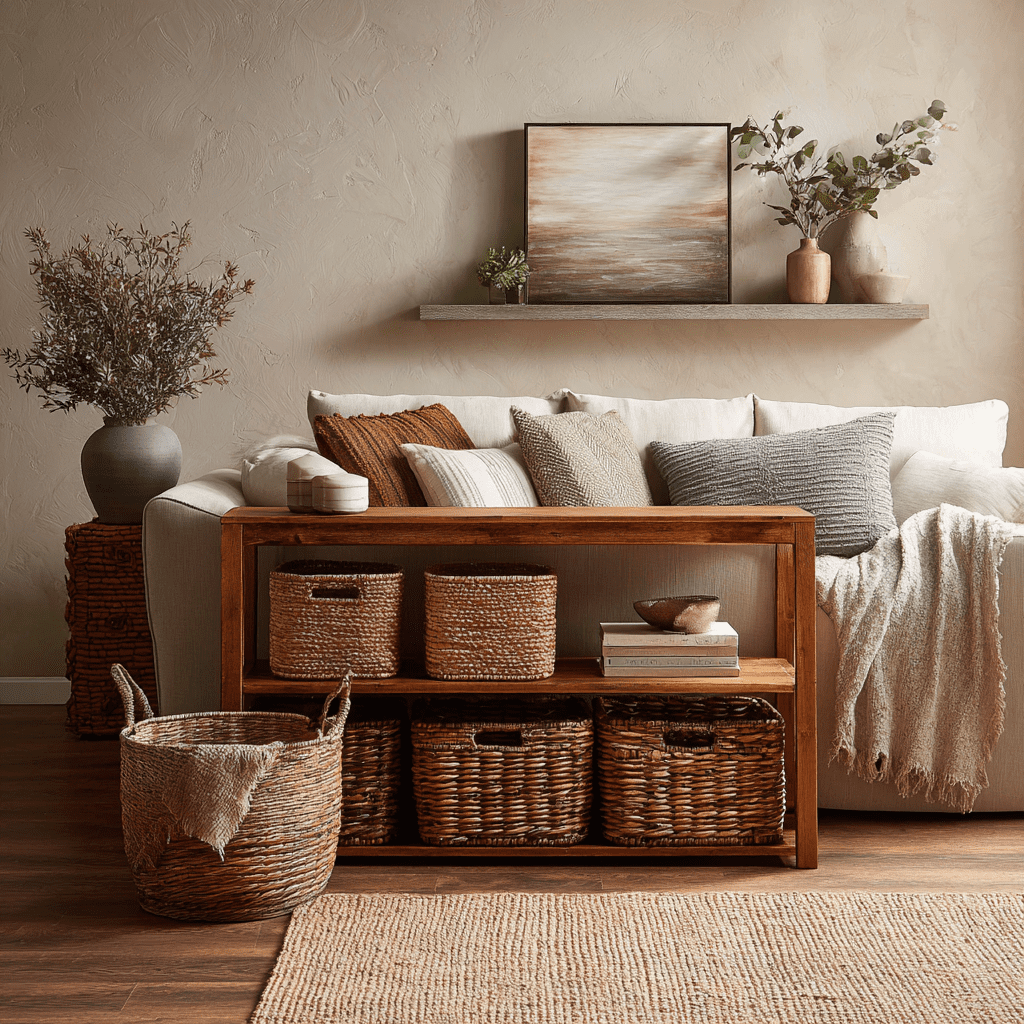 This idea mixes a simple table with woven baskets underneath. You get style up top and hidden storage below.