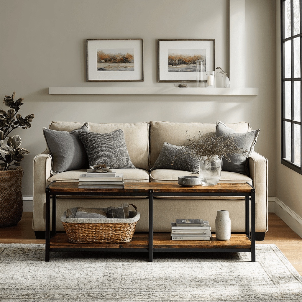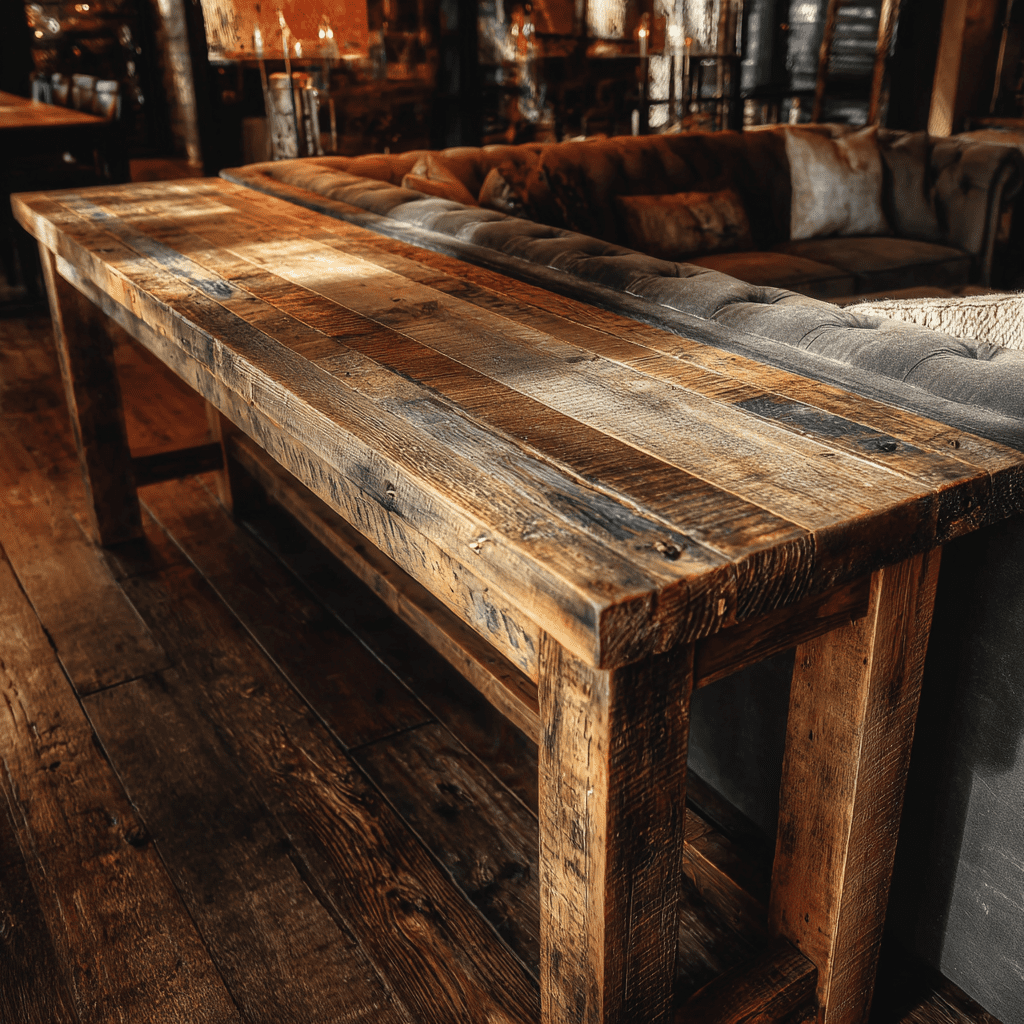 A rustic plank sofa table brings warmth and texture, especially in modern or neutral rooms.