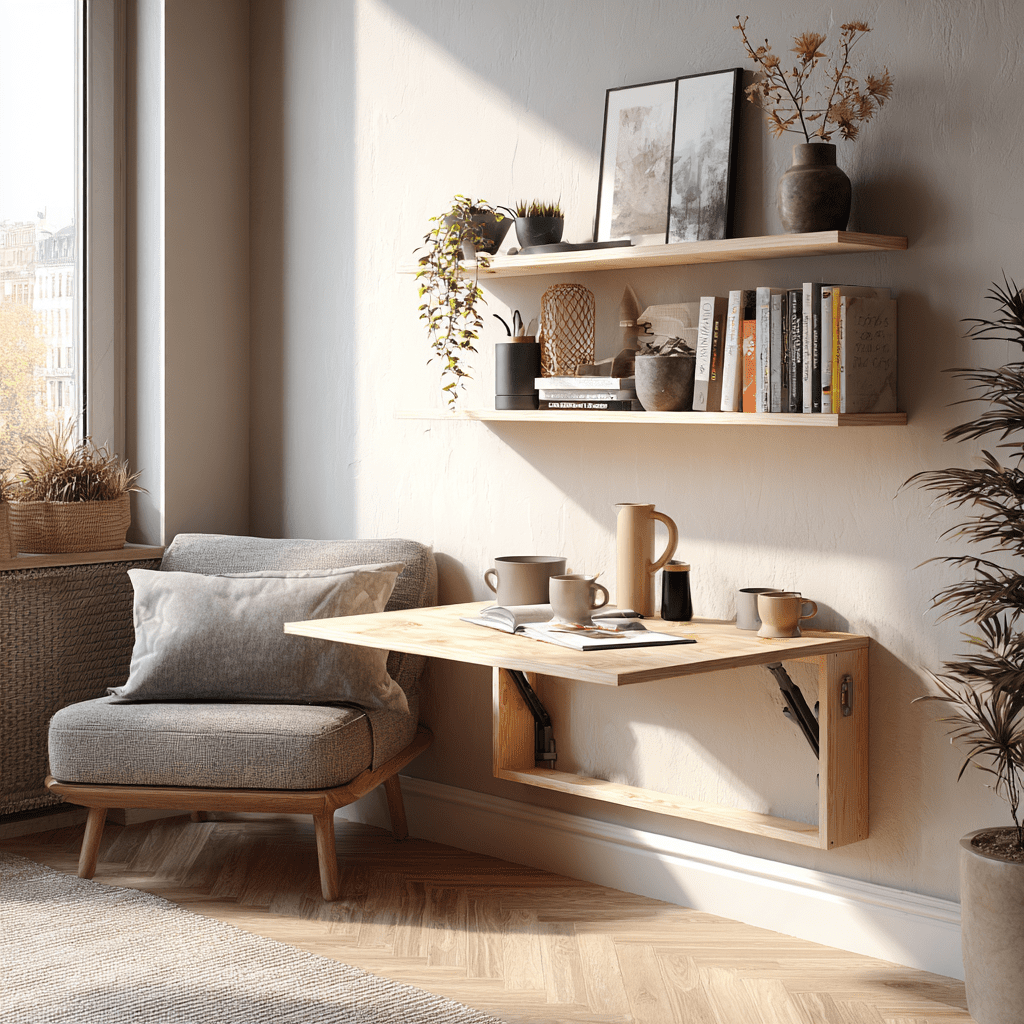 A fold-down sofa table attaches to the wall and flips up only when you need it.