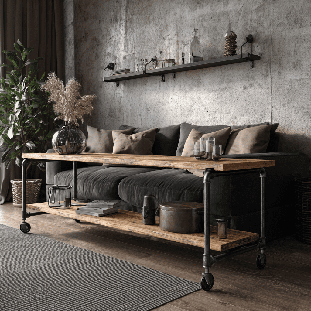 A pipe-frame sofa table mixes wood and metal for an industrial vibe on a budget.
