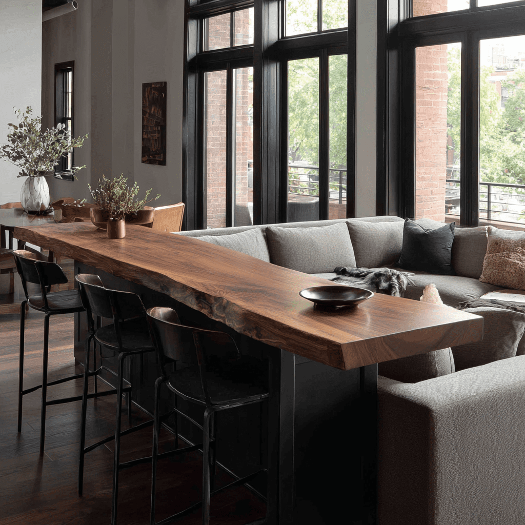 A bar-height sofa table adds a sleek, modern edge and works great for casual dining or drinks.