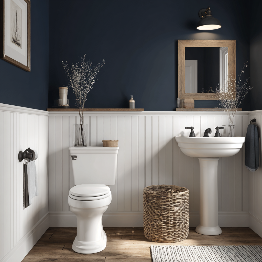 Navy and white is a bathroom classic because it’s clean, bold, and timeless. The navy grounds the space while the white keeps everything fresh and bright. This combo works amazingly in small bathrooms because the contrast gives the illusion of depth.