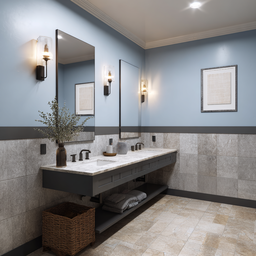 Dusty blue is calm and cool, while stone gray adds quiet strength. Together, they create a bathroom that feels serene without being bland. It’s a grown-up version of blue tones that feels timeless and cozy.