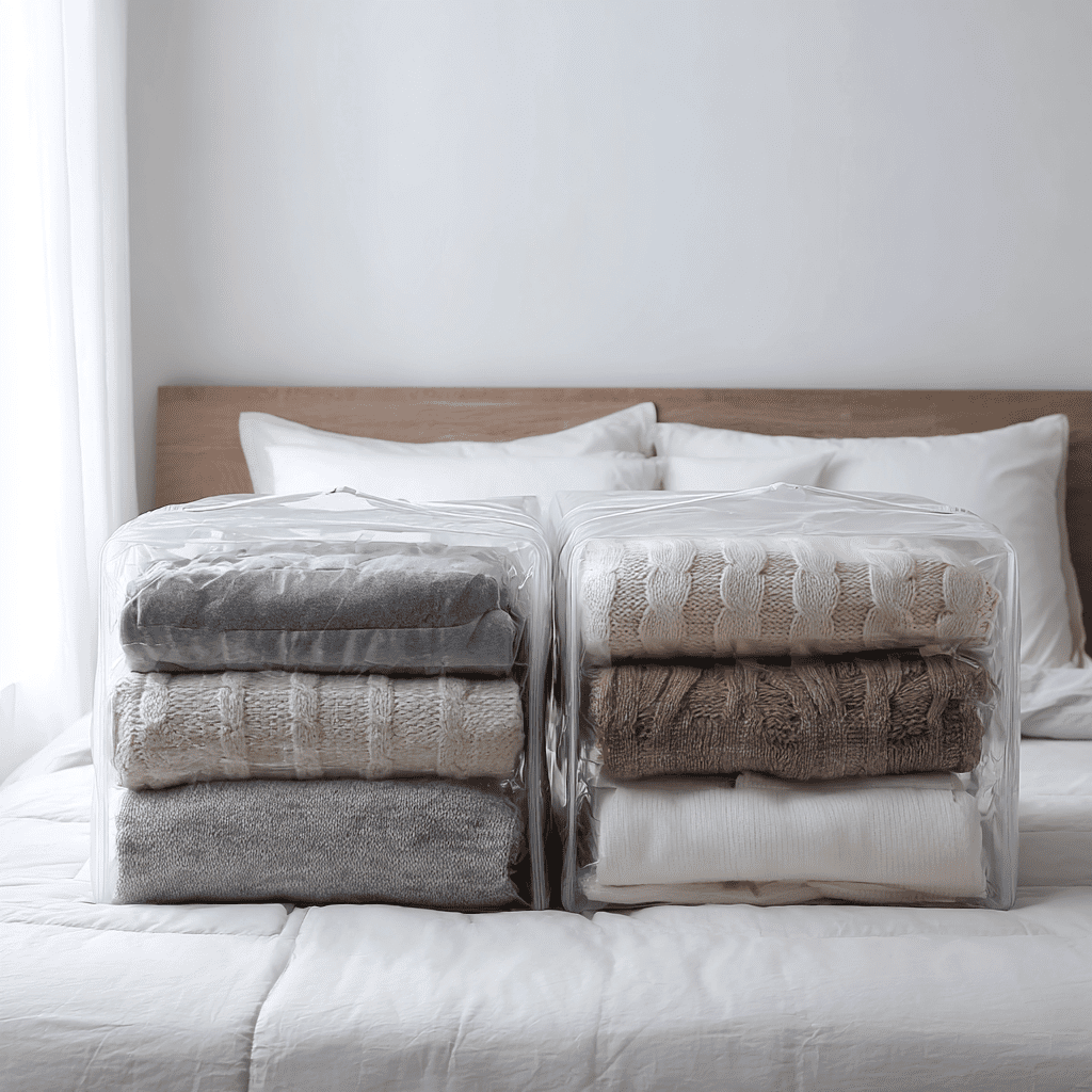 Vacuum-sealed bags shrink everything down to a fraction of the size. You suck out the air and boom, you’ve got way more room under your bed. They’re ideal for fluffy things that normally take up a ton of space.
