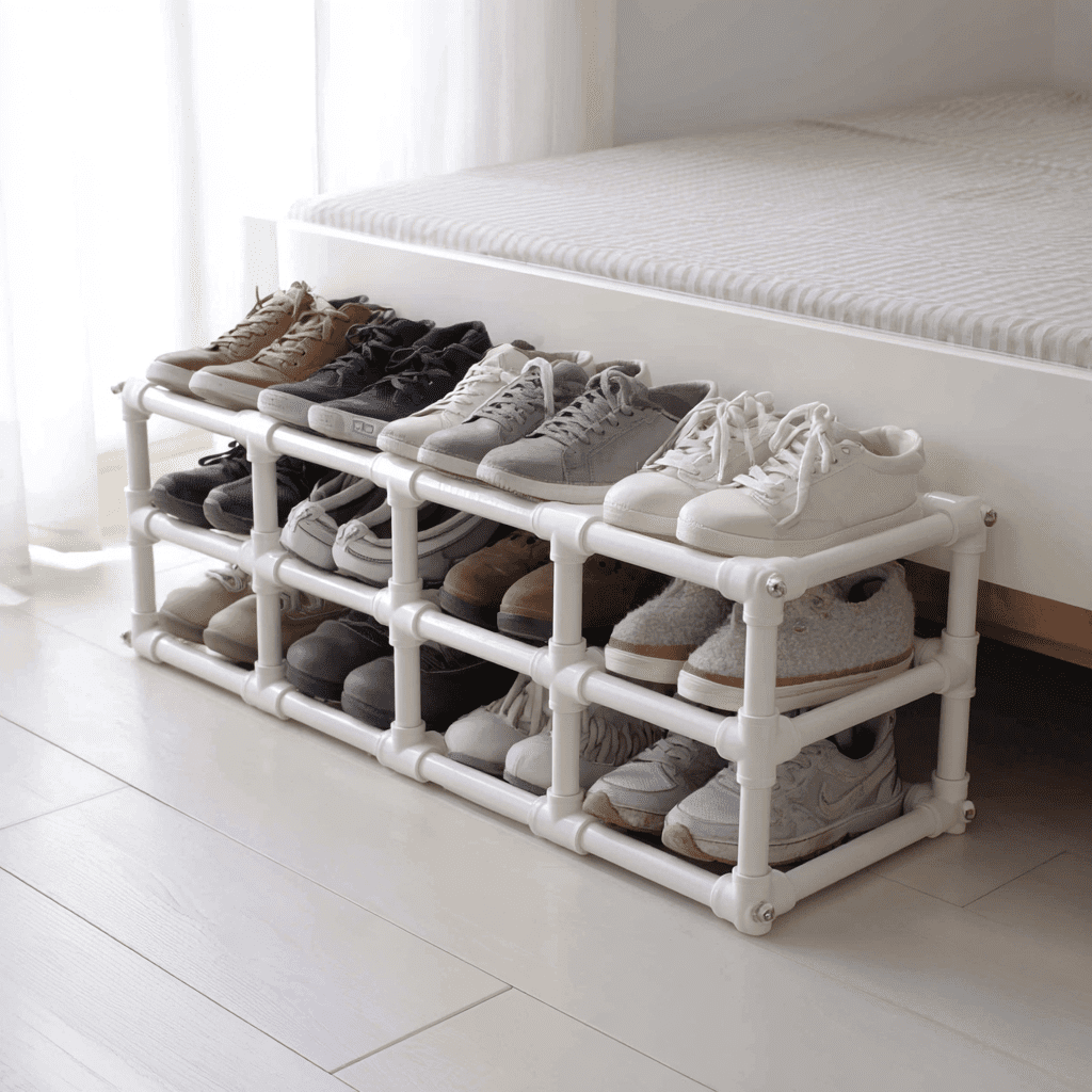 A PVC pipe shoe grid is a DIY storage hack made from short pipe sections arranged like little cubbies. Shoes slide right in and stay upright without touching each other. It’s surprisingly sturdy and very customizable.