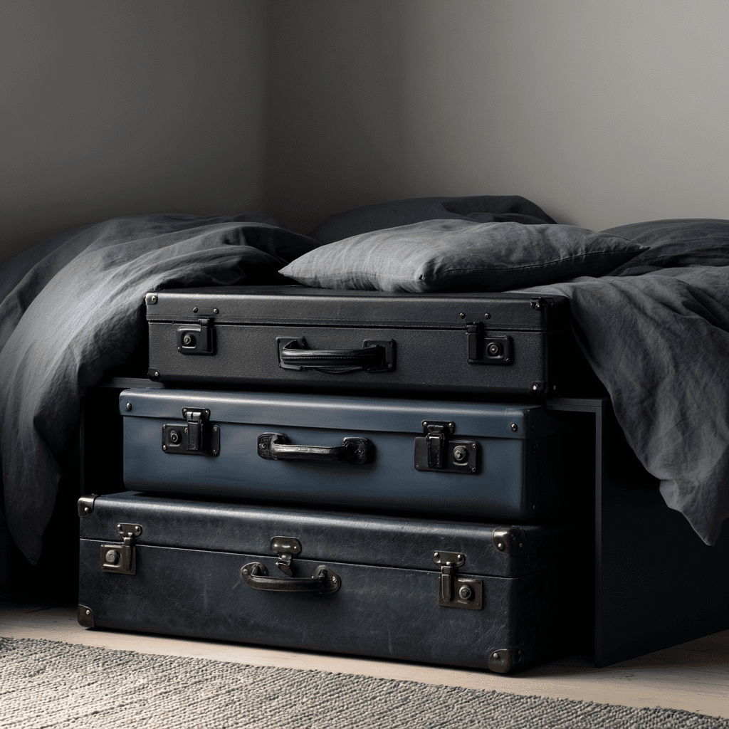 Rolling luggage storage means using your empty suitcases as built-in under bed organizers. They’re already sturdy, dustproof, and mobile. Why not put them to work?